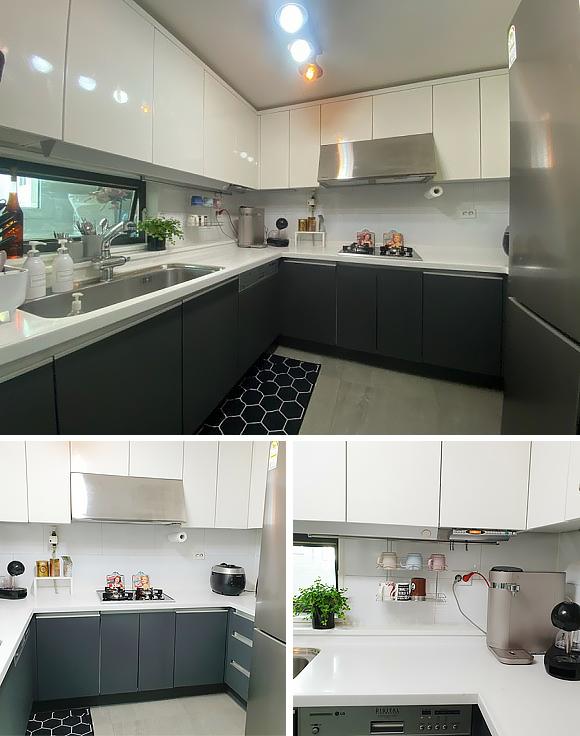 거실과 분리되게 주방 바닥은 다크 그레이 포셀린 타일로 마감했고 싱크 상판을 넓게 쓰고자 가능한 도구들 식기들은 수납장안으로 넣어 사용 중이에요.