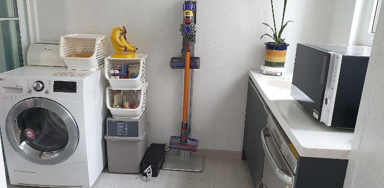 식탁 뒤편 격자 창문 뒤는 보조 주방인데요,- 일용할 간식이 있는 맛있는 공간, 청소기 건조기 다용도실로 사용 중이에요.