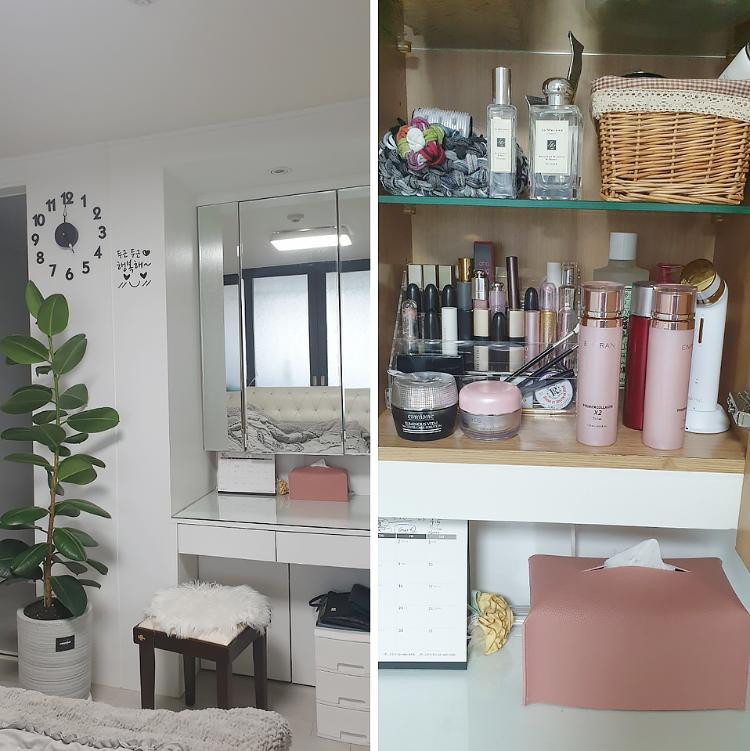 화장대도 달력 티슈케이스 외엔 거울 수납장 안으로 넣어 사용하고 있어요.
