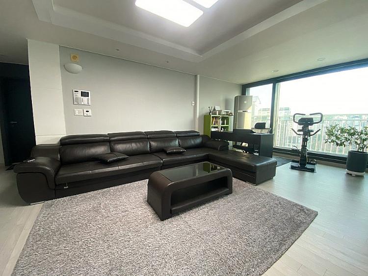 거실 확장으로 6인용 소파가 가능했고 화이트 마루에 블랙 가구들을 배치했어요. 거실 한편 남편의 동굴 아닌 동굴로 책상을 두어 서재처럼 활용하고 있고 에어컨은 2007년 구입한 빨간 하우젠을 시트지 작업해 톤을 맞춘 가구로 변신했어요.