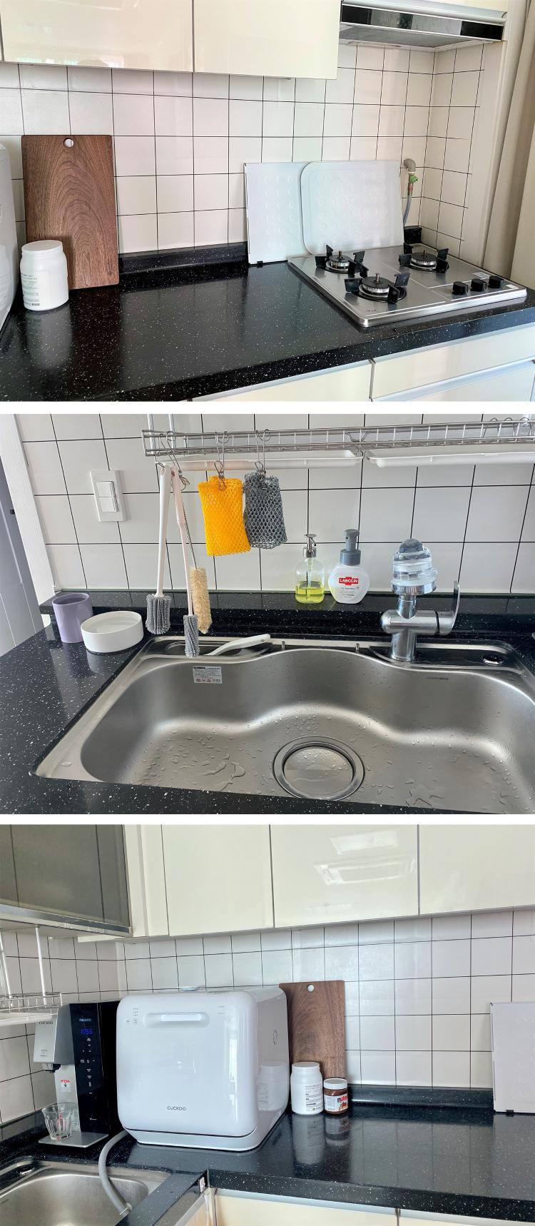 특히 식기나 주방도구들은 항상 청결해야 되기 때문에 바깥에 절대 꺼내 놓지 않습니다. 싱크대 위에는 항상 고양이 물그릇 두 개, 주방 세제, 식기세척기 세제, 손 세정제, 도마, 가스레인지 가드 정도만 있어요. 물건이 많지 않으면 청소가 아주 쉬워집니다.