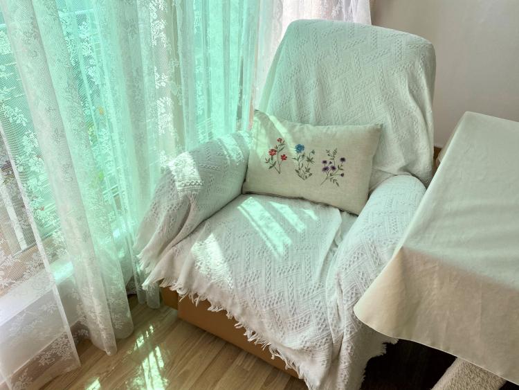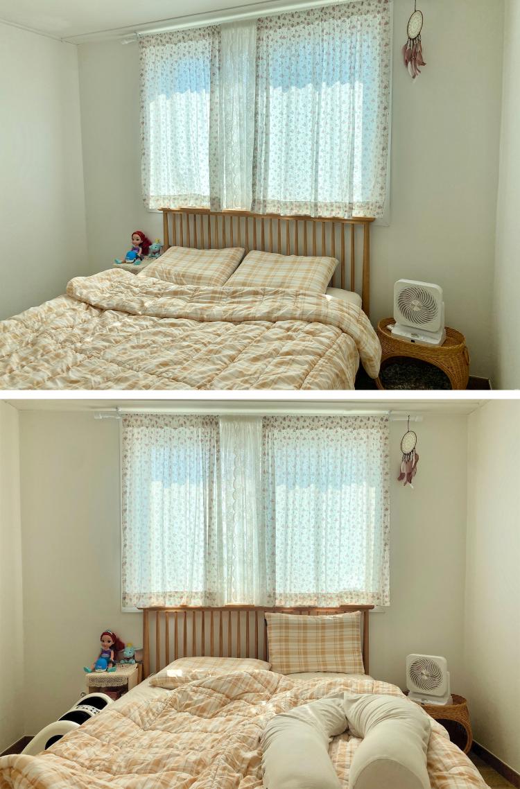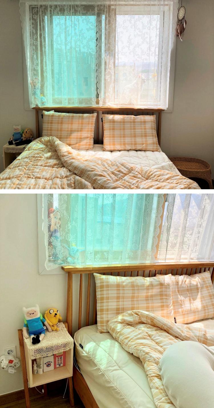 최근 침실의 모습입니다. 침실이 남향이라 망사 커튼만 달기에는 빛이 너무 강해서 따듯한 느낌의 커튼을 하나 더 달았어요. 사진이 안 예쁘게 나왔는데 실제로는 아늑한 느낌이 너무 좋아요. 왼쪽에는 안 쓰던 발 안마기를 둬서 가끔 누워서 안마를 받고 있어요.