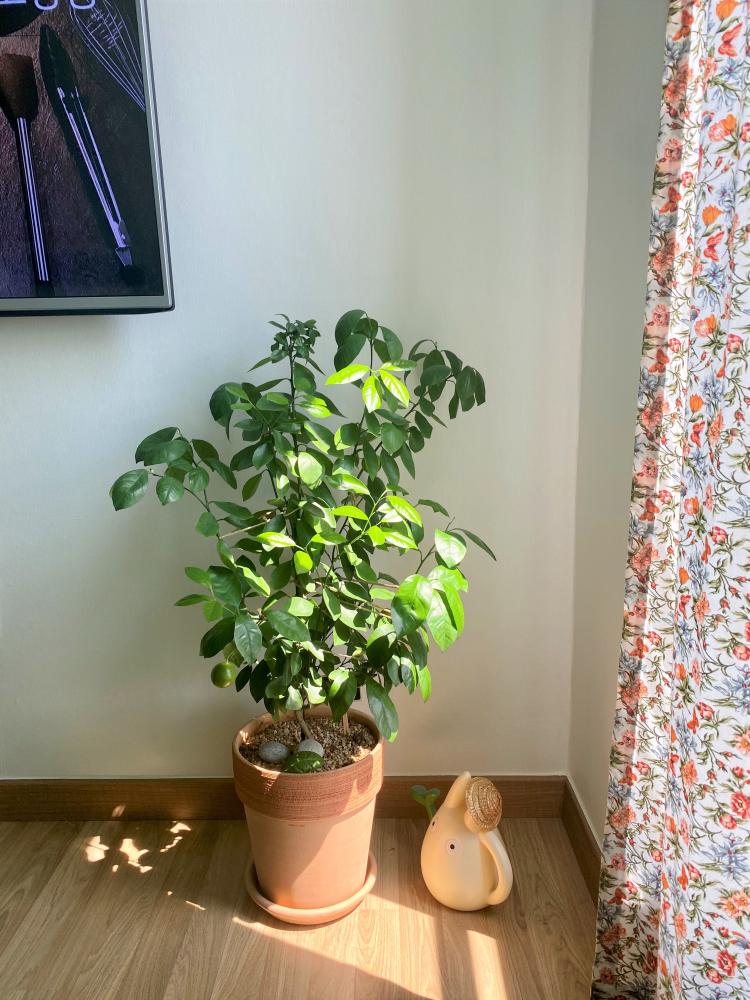 제가 식물 살인마인데 유주 나무는 관리도 쉬워서 1년 정도 잘 키우고 있어요. 향기롭고, 예쁜 하얀 꽃도 피고, 주황색에 귀여운 열매도 열려요. 저희 집 인테리어에도 한몫한답니다.