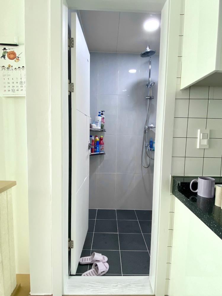 화장실은 투룸이지만 크게 나온 편입니다. 타일이 쏙 마음에 들지는 않지만 바꿀 수는 없기에 그냥 만족하면서 살고 있어요. 화장실은 특별한 것은 없고, 최대한 깔끔하게 유지하면서 지내려고 샤워하면서 자주 청소를 하고 있어요.