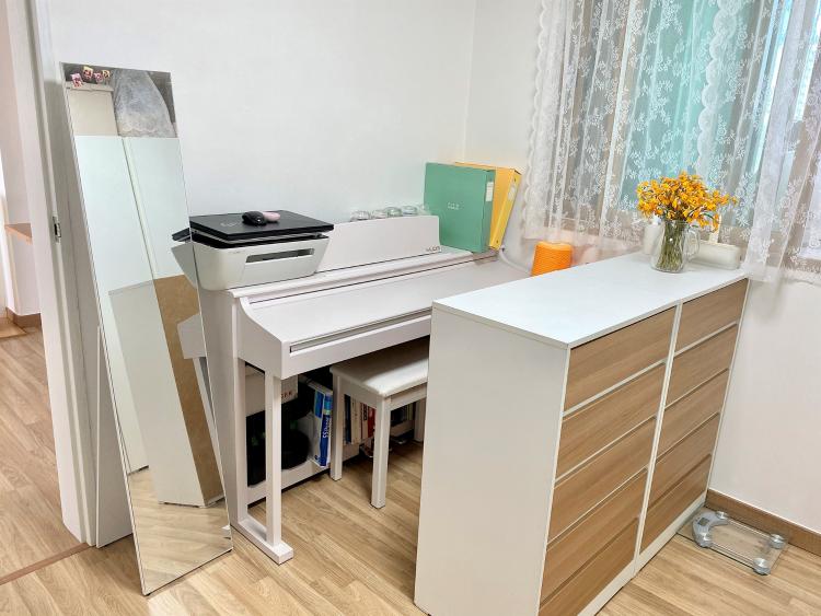 옷장과 화장대를 붙이면 공간이 조금 남는데요. 옷장 쪽에 벽을 살짝 띄워서 손님들이 올 때 펴는 이불 매트와 요가 매트, 폼롤러를 숨겨 놨어요. 그 밖에도 피아노 아래에는 책이 가득하고, 침대 밑에도 이불 수납하는 리빙 박스가 있고, 신발장도 창고로 사용하고 있어요. 좁은 집이라 수납공간을 잘 활용하려고 하고 있어요.