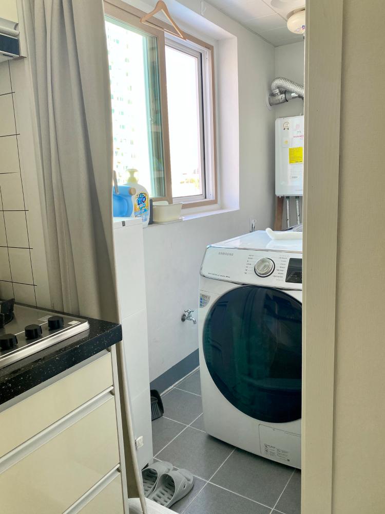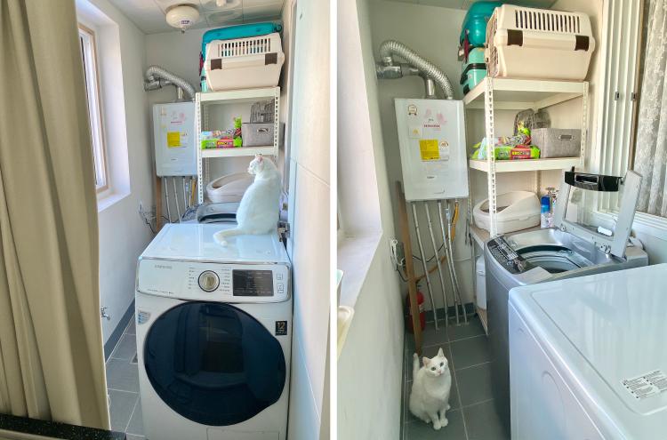 베란다는 보일러 때문에 아직 지저분한데요. 조만간 가리개 커튼을 만들어서 깔끔하게 숨기려고 하고 있어요. 베란다 안에는 건조기, 통돌이 세탁기, 철제 앵글이 있어요. 세탁기는 원래 쓰던 제품이고, 건조기는 이사 오면서 구매했는데요. 세탁기가 통돌이이다 보니 쌓지 못해서 베란다가 좁아졌어요. 그래서 절제 앵글을 뒀는데요. 밑에서 1단, 2단에는 고양이 화장실과 쓰레기통이 있고, 3단에는 고양이 용품, 4단에는 고양이 이동장과 캐리어가 있어요. 철제 앵글은 조립도 쉽고, 정리가 잘 되어서 진짜 잘 샀다고 생각해요.