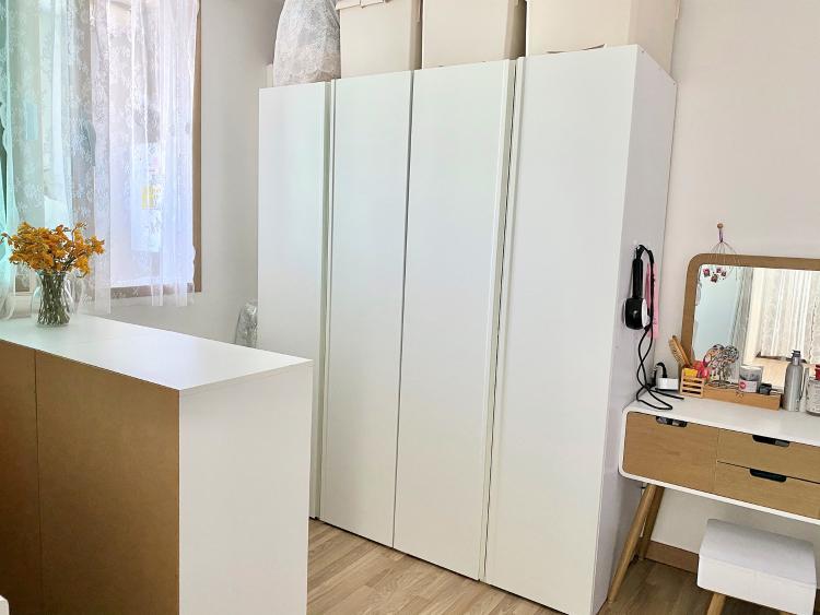 작은방은 옷방으로 사용하고 있어요. 좁은 공간이라 나름대로 가구배치에 신경을 썼습니다. 집에 있는 가구는 거의 4년 전에 산 거지만 옷장은 이사 오면서 구매했어요. 전 집에서는 행거를 사용하고, 옷방 문은 닫아 놓고 살았는데요. 고양이들이 방안이 궁금해서 방문을 긁기도 하고, 가끔 들어오면 숨어서 옷이 털 범벅이 되었어요. 옷장 사용하니까 훨씬 깔끔해 보이고, 방문을 열고 지낼 수 있어요. 그리고 옷장 위에 리빙 박스로 수납을 할 수 있어서 좋습니다