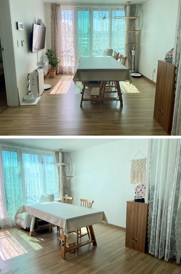 저희 가족은 대부분의 시간을 거실에서 보내요. 예전에는 큰 소파가 있었는데요. 고양이들이 자꾸 뜯어서 소파 대신 커다란 6인용 식탁을 두고, 식탁 겸 테이블로 활용하고 있습니다. 식탁은 오래된 거라 칠이 벗겨져서 식탁보를 씌워서 사용하고 있어요. 소파가 있을 때는 드러누워서 늘어져 있었는데, 식탁을 두니 앉아서 무언가 하게 되어서 좋습니다. 소파가 없어도 불편하지 않고, 부지런한 사람이 된 것 같아 좋아요.