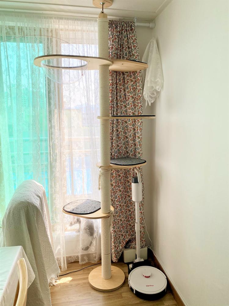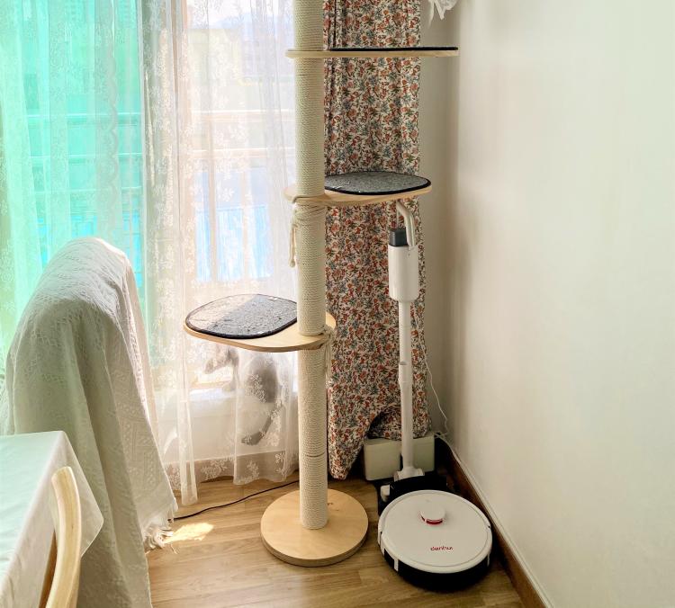 리클라이너 소파 뒤에는 고양이들 캣폴과 무선청소기, 로봇청소기가 있습니다. 고양이들이 편안하게 바깥은 구경할 수 있도록 햇볕이 잘 들어오는 창가에 설치했어요. 캣타워는 부피가 너무 커서 캣폴을 선택했고, 이사 갈 때도 쉽게 분리돼서 좋습니다. 원래는 기둥에 전용 스크래처 패드를 붙이는 건데요. 자주 교체해줘야 되고, 색상도 마음에 안 들어서 저는 면로프를 감았어요. 면로프는 튼튼하고, 고양이들도 스크래처로 잘 써서 테이블 다리에도 감아서 쓰고 있어요.