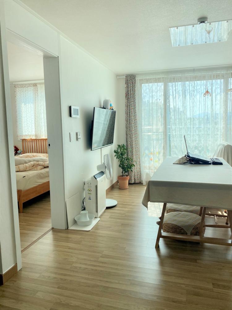 식탁 앞에는 벽걸이 티비를 설치했어요. 전세이지만 집주인분께 허락을 받고, 벽걸이 티비와 가벽, 정수기 등을 설치했습니다. 허락은 해 주셨지만 제 집이 아닌지라 최대한 구멍을 덜 뚫어서 설치했어요. 티비는 소파가 아닌 의자에 앉아서 봐야 되기 때문에 일반적인 설치 높이보다 더 높게 설치했습니다. 티비 옆에는 공기 청정기와 고양이 정수기, 유주 나무가 있어요.