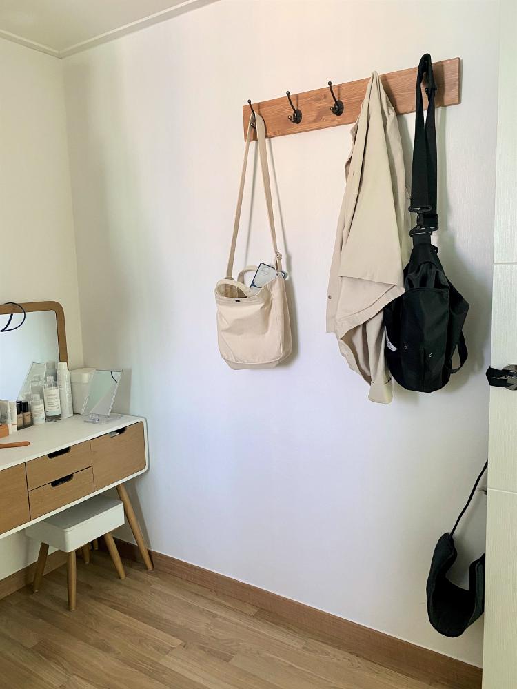 옷방 벽 한쪽에는 빈티지 옷걸이를 달았어요. 전에는 일반 옷걸이에 옷을 걸어서 행거에 보관했는데요. 쓰다 보니 거는 게 귀찮아서 아무렇게나 옷을 걸게 되더라고요. 그래서 조금이나마 깔끔해 보이려고 구매했는데, 아주 잘 사용하고 있어요.