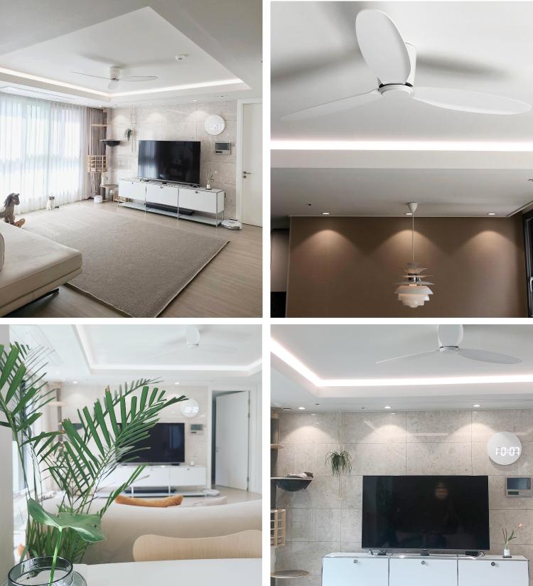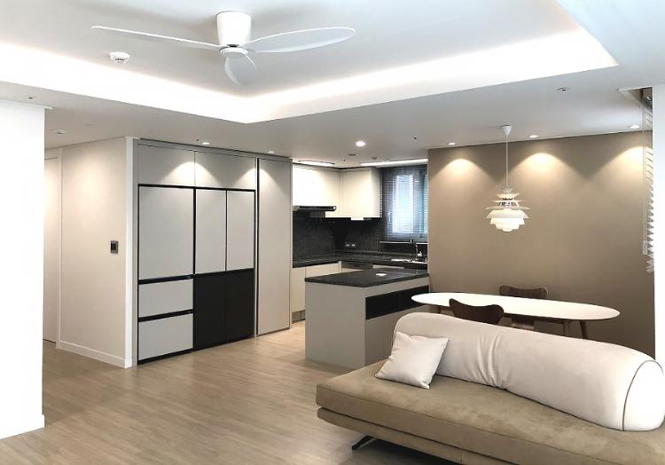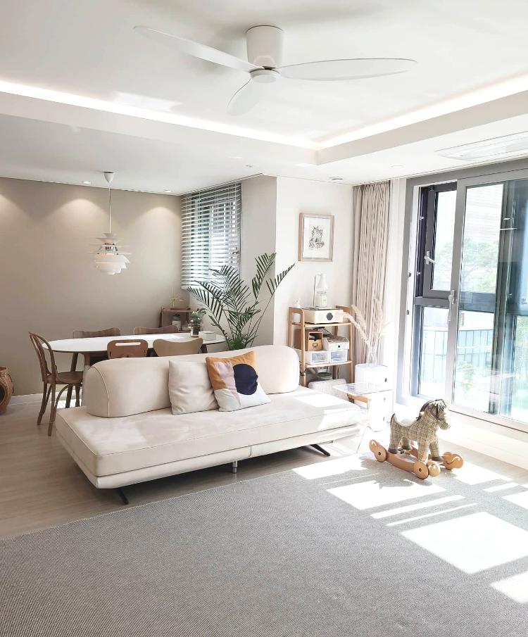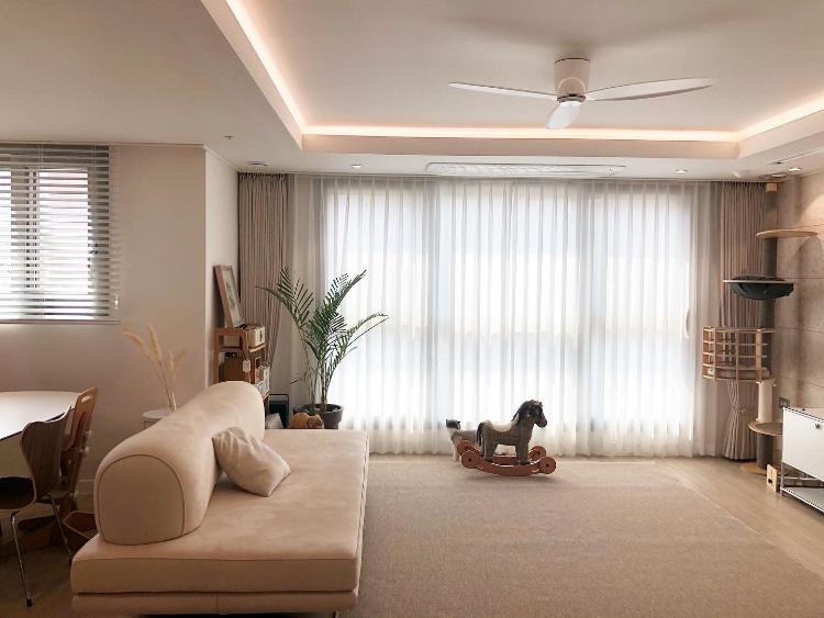 집에서 가장 오래 있는 공간이기에 오롯이 우리의 취향을 반영한 가장 애정 하는 공간입니다. 거실 메인 등을 없애고 실링팬을 시공한 게 신의 한 수라고 생각 ㅎㅎ 실링팬은 사랑입니다^^ 신문물을 좋아하는 신랑 덕분에 전동스크린과 전동 커튼을 설치했는데 굉장히 편리하게 잘 사용 중입니다