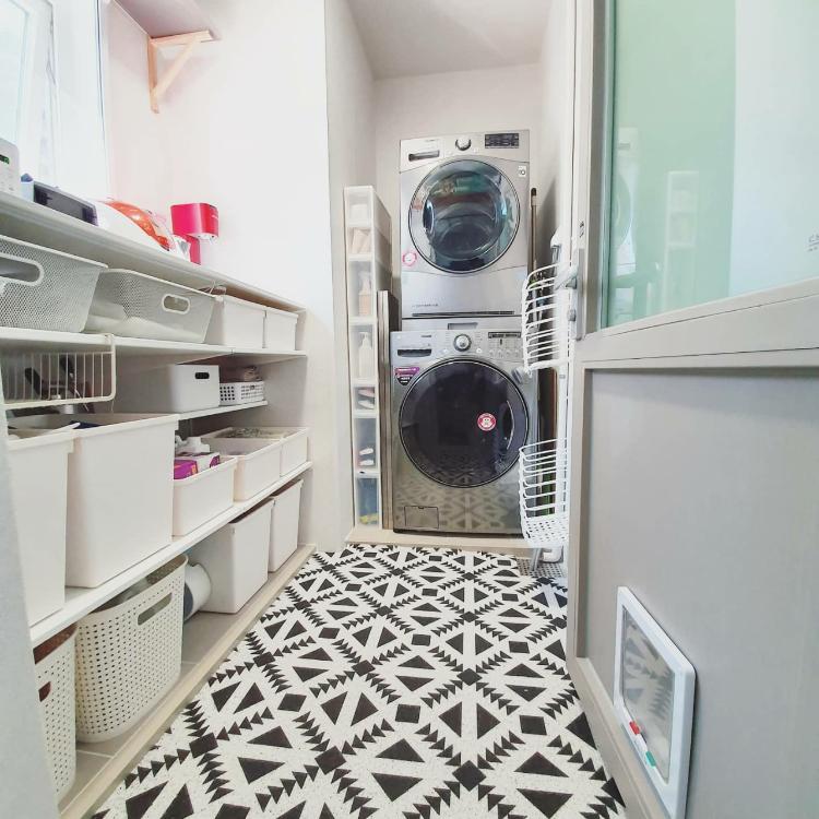 다용도실에도 알고트를 설치해서 최대한 많이 수납할 수 있게 실용적으로 공간을 꾸며보았습니다. 세탁기와 각종 보조가전을 사용해야 해서 맨발로도 드나들 수 있게 코일매트를 깔았는데 디자인이 산뜻해서 다용도실 분위기가 밝아졌네요.