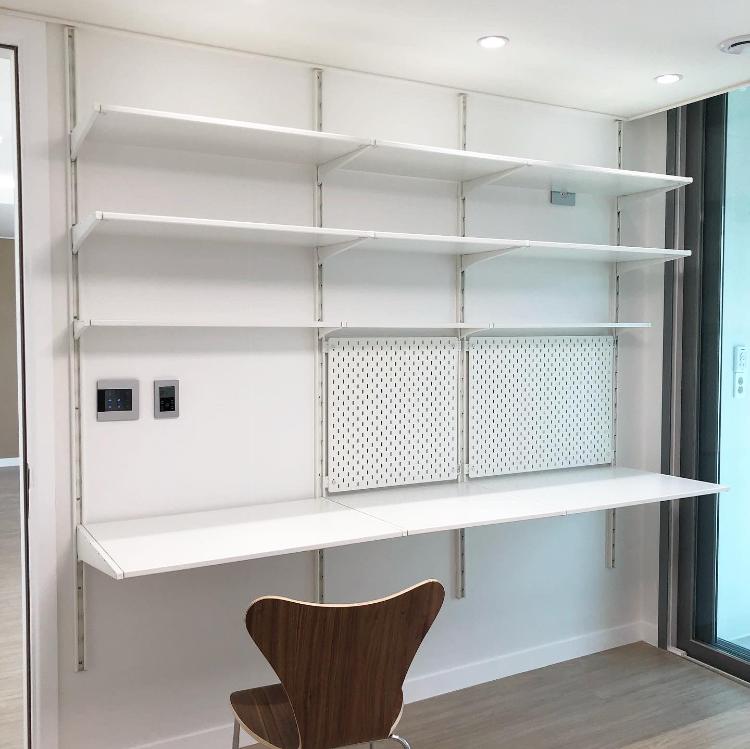 붙박이장 맞은편 벽은 알고 트로 시스템 선반을 설치했는데 셀프로 설치하기엔 난이도가 꽤 높아서 고생을 많이 했네요ㅎ 그래도 완성된 모습을 보면 뿌듯합니다^^