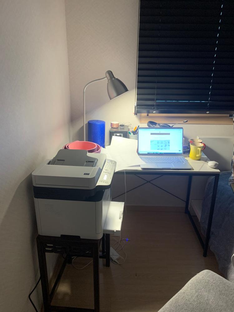 작은방 공간-퀸사이즈 침대, 퍼시스 책상, 그리고 삼성레이저프린터 복합기 (SL-C563FW) 쓰고 있습니다. 교육대학원을 다니면서 일을 하고 있는데 코로나로 인해 온라인 수업이 많아져서 필요해져서 샀습니다. 너무 편리하고 가성비 너무 좋은 것 같습니다. 침대-전에 있던 오피스텔에서 쓰던 퀸사이즈 부모님혹시 오시면 쓰실 공간 필요할 것 같아서 작은 방에 침대로 두었습니다. 서재겸, 공부방, 홈오피스로 쓰고 있는 곳에 노트북 삼성 시리즈 쓰고 있어요.