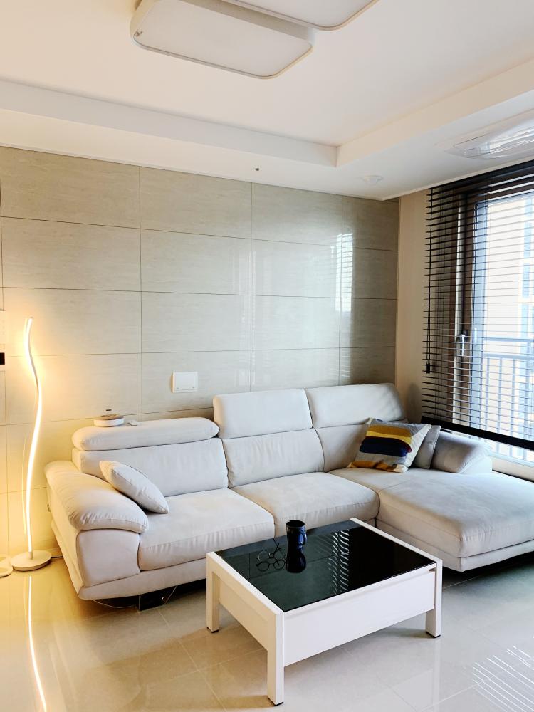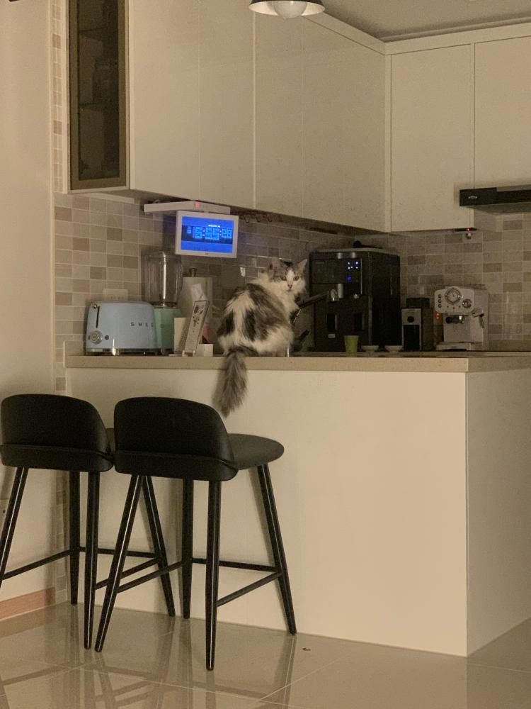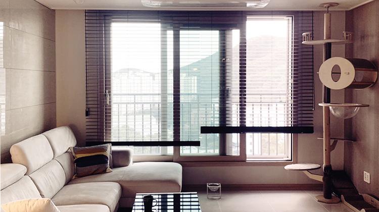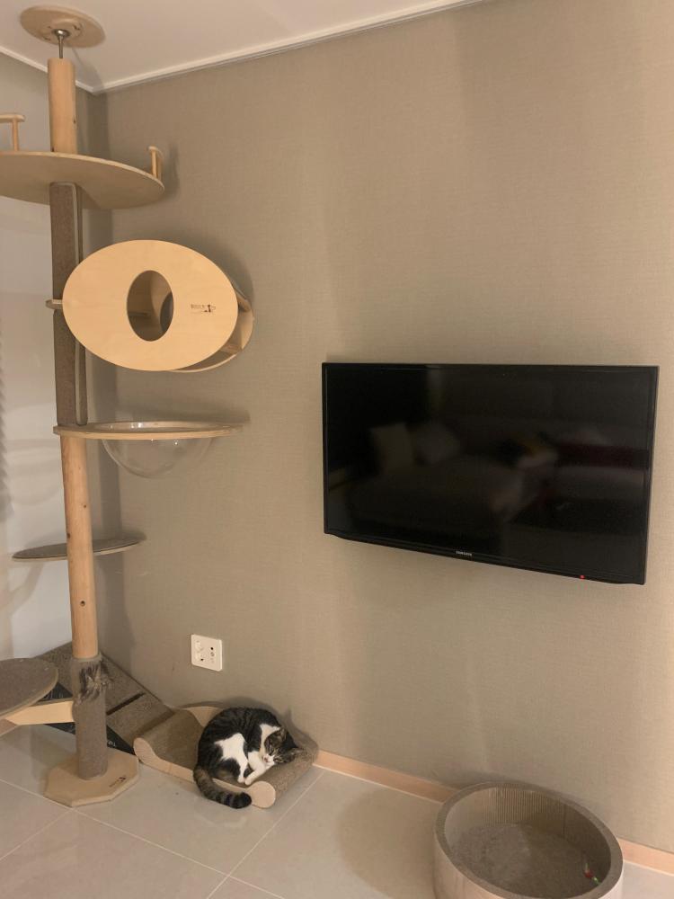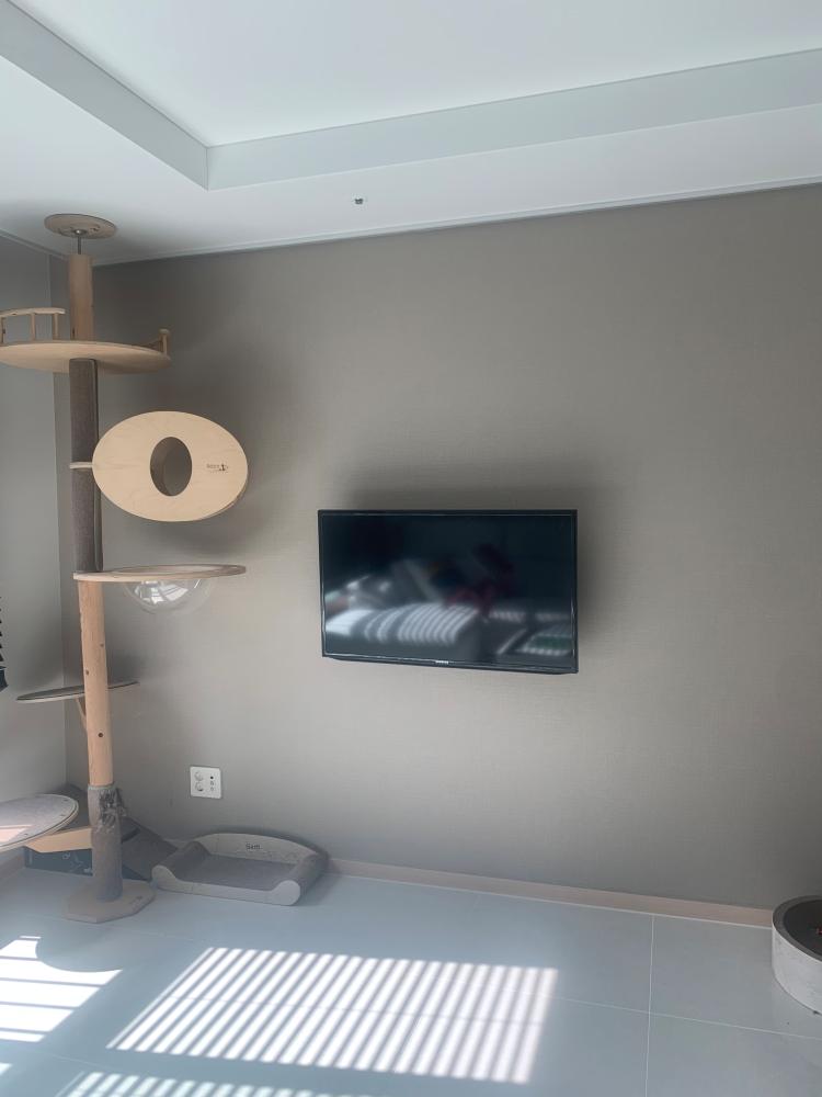 티비는 삼성 벽걸이 티비 인데 모델명은 잘 모르겠어요 ^^;;. 거실에도 천장에 LG시스템 에어컨이 설치되어 있습니다. 소파 테이블은 리프팅 테이블이구요. 고양이들을 위해서 곳곳에 스크래쳐 설치되어 있습니다.