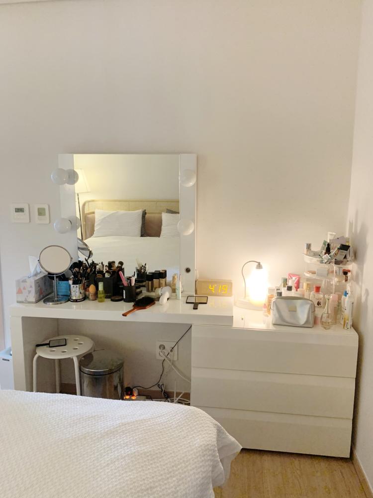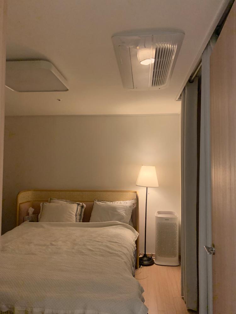 화장대-수납형 서랍이 딸린 화장대인데 거울은 제가 화장을 좀 좋아하는 편이라서 조명달린 거울조명을 따로 사서 합쳐서 쓰고 있습니다. 안방의 왼쪽 편에는 문이 두 개 있는데 첫 번째 문은 샤워부스 딸린 화장실이구요, 오른쪽 문은 드레스룸입니다. 안방의 가전제품 소개-삼성블루스카이 공기청정기 쓰고 있습니다. 에어컨은 LG시스템 에어컨이구요, 그리고 루나가습기 쓰고 있습니다.