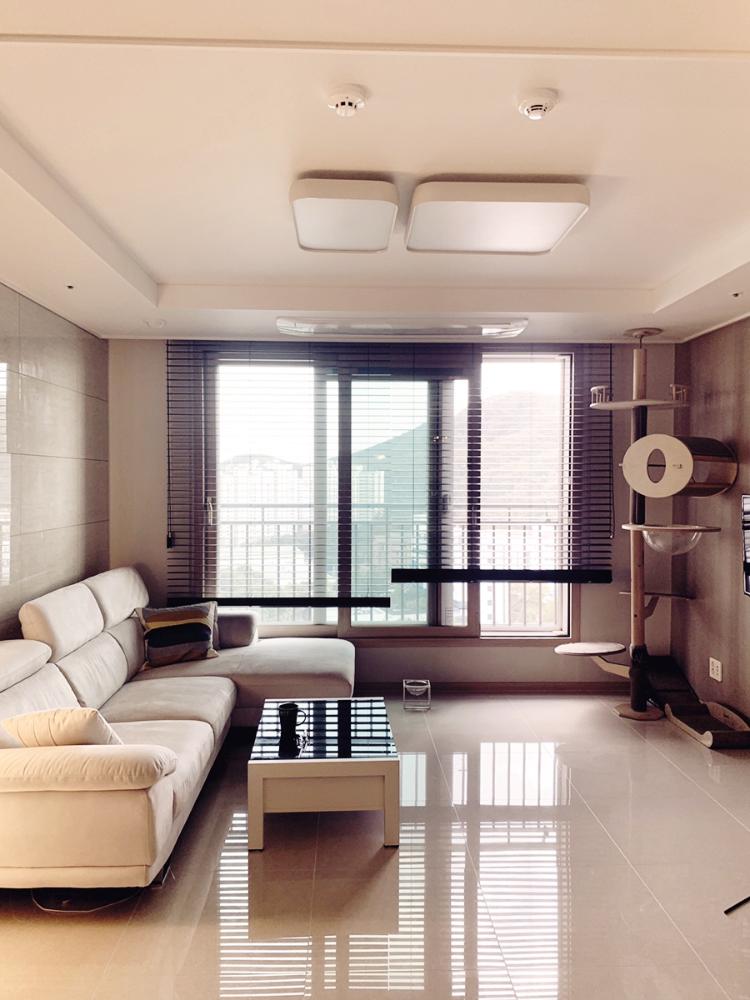 모던한 분위기를 좋아해서 저는 바닥 소재도 폴리싱 타일로 선택해서 꾸몄습니다. 저희 집의 경우에는 고양이 두 마리가 있기 때문에 화장실을 같이 쓸 수 있어서 너무 좋아요 ^^. 전반적으로 필요 없는 공간 없이 가장 필요한 공간인 거실과 안방에 중점을 두고 디자인된 구조인 것 같아서 아주 만족하고 있습니다.