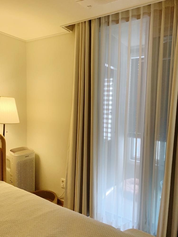 낮잠을 자거나 할 때 빛이 들어오면 치명적이라고 생각해서 암막커튼은 필수였어요. 저 커튼은 가성비도 아주 좋고 쉬폰 커튼은 안 잘 때 하늘하늘 이쁘고 분위기 있어요~