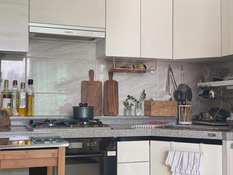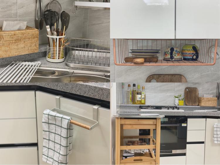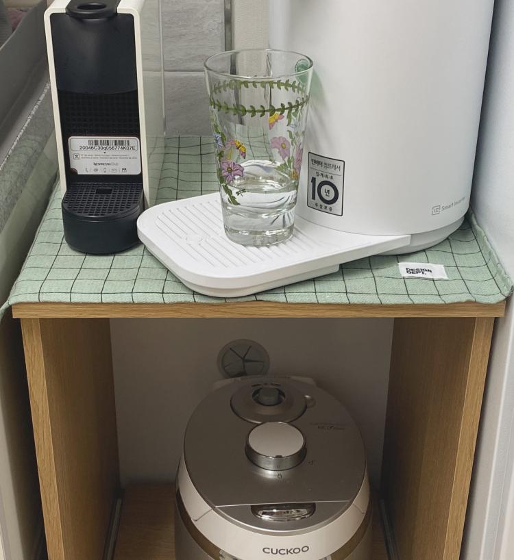 전셋집이라 주방에 큰 변화를 줄 수 없어서 우드톤 수납함, 케이스 등을 배치하여 공간에 통일감과 조화로움을 주었어요.