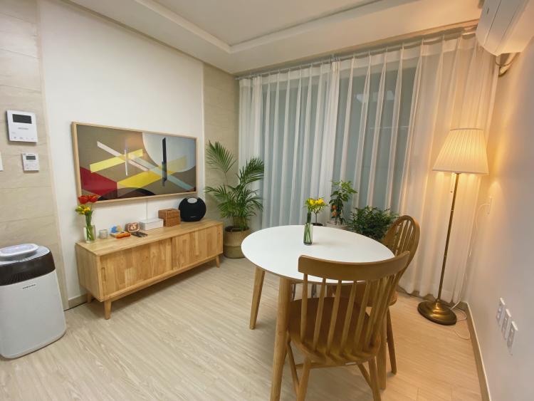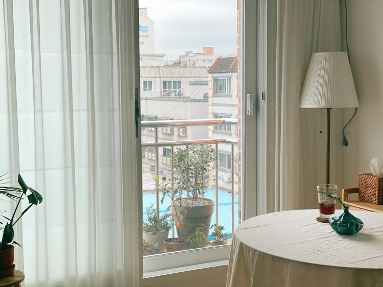 신랑이 좌식을 불편해하는데 소파와 식탁을 같이 둘 만큼 넓은 집이 아닌 것 같아 소파를 포기하고 원형 식탁을 두게 되었고, 그러다 보니 자연스럽게 집이 카페 같은 분위기가 되었어요! (그런데 살다 보니 소파의 필요성을 느끼고 조만간 구매할 예정이에요 ㅎㅎ) 이 집이 마음 들었던 이유 중 하나는 거실 창밖으로 높은 건물이 없고 해가 잘 드는 거였는데요. 남서향이라 오후에 들어오는 해가 정말 예뻐요.