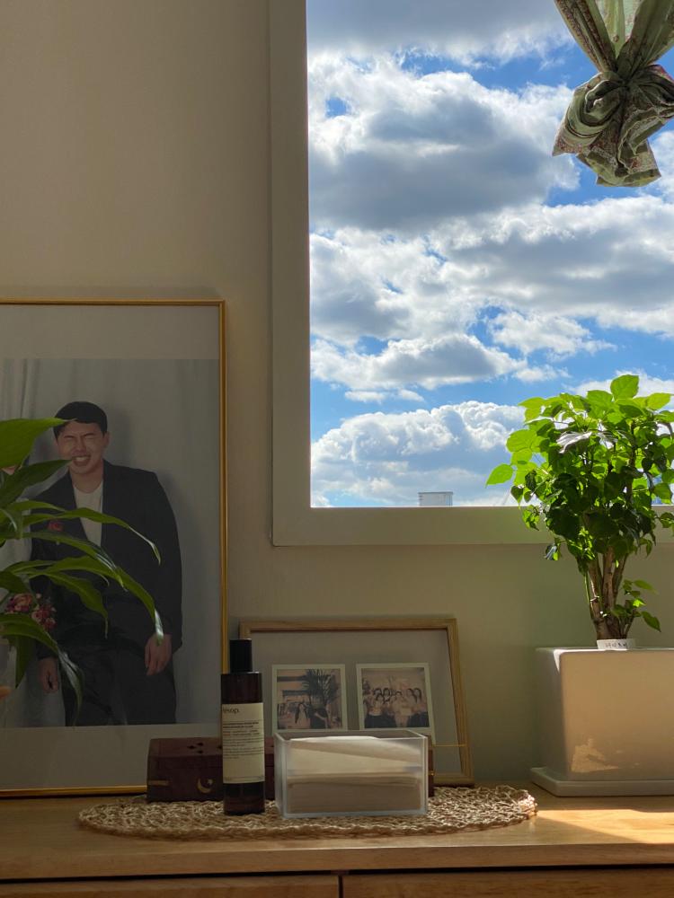 원목 서랍장 위에는 액자와 사진 소품을 올려두고, 기분에 따라 바꿔주기도 하고요, 침대에 누워 창문을 보면 하늘이 너무 잘 보여서 때로는 하염없이 창밖을 명상하기도 하고, 해도 너무 잘 들어와서 주말 낮에 침대에 누워 일광욕을 즐기기도 한답니다.