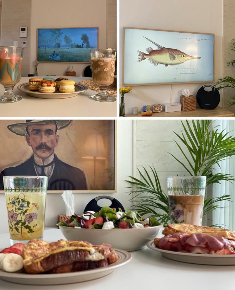 저희 집 티비는 집들이 때도 항상 주목받는 가전이기도 하고, 어떤 그림이냐에 따라서 집 분위기를 크게 바꿔주어서 아주 만족스럽게 사용하고 있어요 :) 사진에서 보이는 그림에 따라 조금씩 느낌이 다르지 않나요?