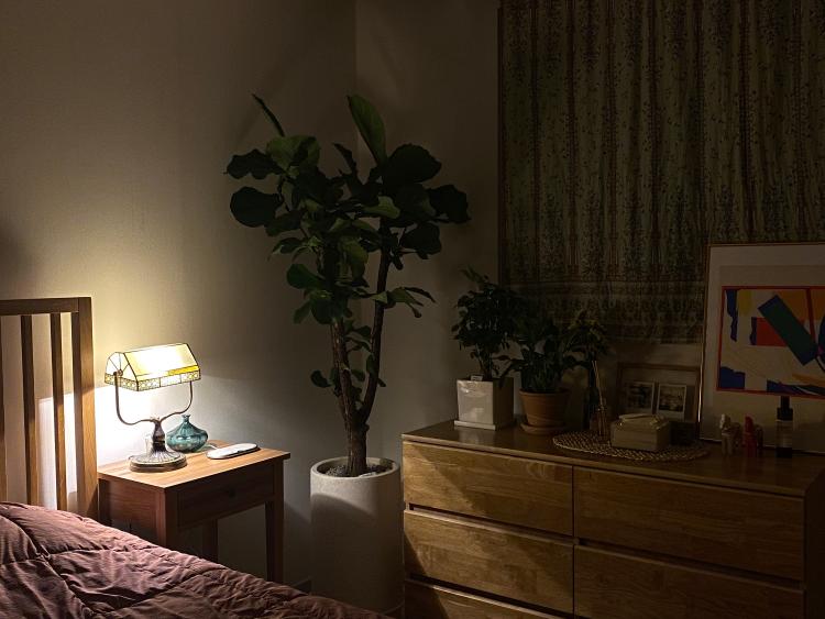 머리가 복잡할 땐 나무 가득한 숲길 걷는 상상을 하는 걸 좋아하는 저는 침실도 굵직한 가구는 원목으로 채우고 나머지 공간엔 식물을 두어 작은 숲속 같은 분위기를 만들었어요.