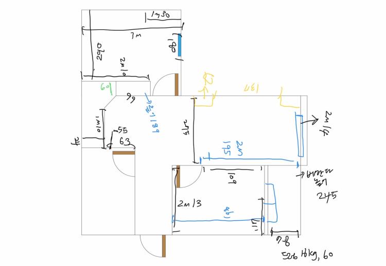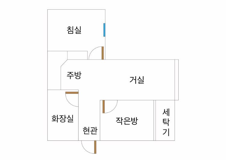 저희 집은 실평수 9평의 아주 작은 집이에요. 주방과 거실, 방 2개, 화장실 1개로 구성되어 있고 모든 공간이 아담하답니다. 평면도가 따로 없어서 가전가구를 고르기 전 정확한 공간 측정을 위해 직접 도면을 그렸어요. 집이 정말 작기 때문에 공간 활용을 하기 위해선 계산적으로 물건을 사고 배치하는 게 중요했거든요.