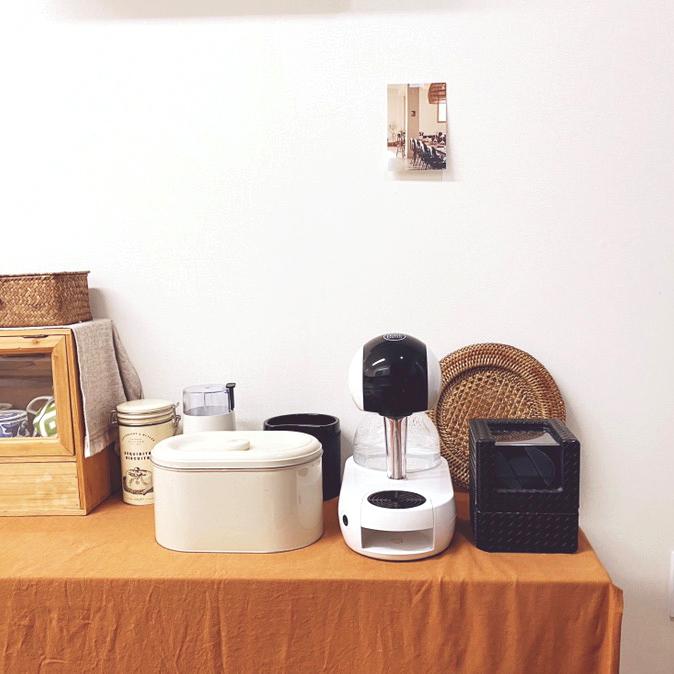 이사 오기 전 사용하던 책상이 이사 와서 홈 카페 테이블이 되었어요. 하단에는 수납을 하기 위해 테이블보를 씌우고 사용하고 있습니다. 새로 사는 가구보다는 기존의 가구 활용하는 게 더 좋을 때가 있습니다.