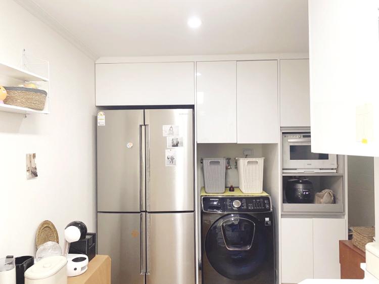 이 공간은 없는 공간이었어요. 제가 갔을 때는 기존 옥탑으로 올라가는 계단이 있었어요. 그래서 전문가와 상의 후 철거하기로 했어요. 저희 집은 벽돌로 지어진 집이고, 오래된 집이라, 가장 오랫동안 고민 후에 철거하였습니다. 그렇게 큰 가전들을 넣을 수 있는 공간이 생겼어요. 원래 세탁기는 화장실에 있었는데 이렇게 한자리에 모두 모였습니다. 세탁기 위에 건조기, 밥솥 옆에 에어 프라하이기만 있으면 되는데 말이죠. 흠 ㅋㅋ 미니멀 라이프를 꿈꾸지만 여전히 맥시멈 라이프 삶을 살고 있습니다.