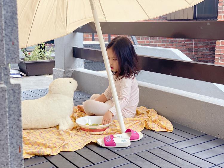 아파트에는 베란다가 있지만, 저희 집엔 이렇게 작은 마당이 있습니다. 요즘처럼 바람이 시원한 날엔 파라솔 밑에서 과일을 먹기도 하고, 캠핑의자를 두고 하늘을 보기도 하고, 햇빛 아래 침구류를 소독하기도 해요. 주택으로 이사 온 뒤 햇빛 반짝일 땐 빨래할 생각이 기분이 좋습니다.