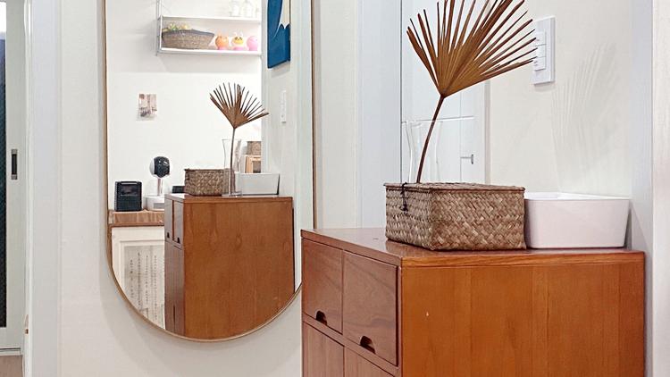 화장실앞 공간입니다. 전신거울과 수납장을 두었어요. 수납장에는 온가족 생활용품이 들어가 있습니다.