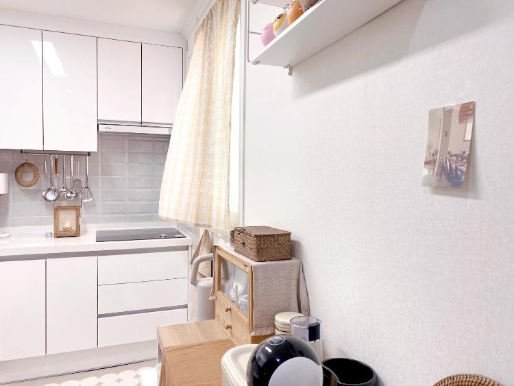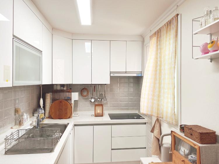 제가 주방 리모델링에서 원하는 부분은 두 가지였습니다. 창문 살리기, 화이트톤 두 가지를 위해 기존의 ㄱ 자 방향에서 반대로 싱크대를 교체했어요. 그리고 맞은편 벽 쪽에 상부장을 추가로 설치하여 주방의 수납력을 높였습니다. 사실, 저도 요즘 인테리어처럼 상부장 없는 주방을 꿈꿨지만, 지금 생각해 보면 큰일 날일이었어요.
