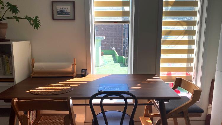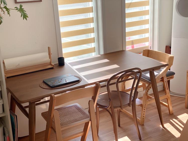 이 창으로 아이와 하늘의 구름도 별도 달도 볼 수 있게 되었어요. 그리고, 식탁은 2인 식탁을 사용하다가 얼마 전에 큰 식탁을 들였어요. 이 식탁을 구매하는데 조금 보태서 정말 우리나라에 있는 모든 식탁을 다 본 것 같아요.^^ 무엇보다 집이 작기에 큰 식탁이 필요할지, 자리 차지만 하는 건 아닐지 정말 많이 고민했어요. 색도 좋아하는 월넛으로 할지 조금이라도 넓어 보이는 흰색으로 할지 아휴 말도 마세요. 오랜 고민 끝에 저희 집에 온 식탁이 정말 너무너무 마음에 들어요. 작은 집이라도 식탁은 식탁 다운 걸 추천합니다. 저는 1600사이즈의 식탁입니다.