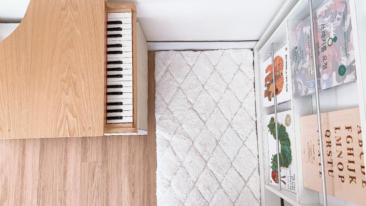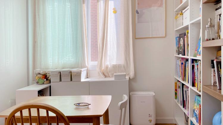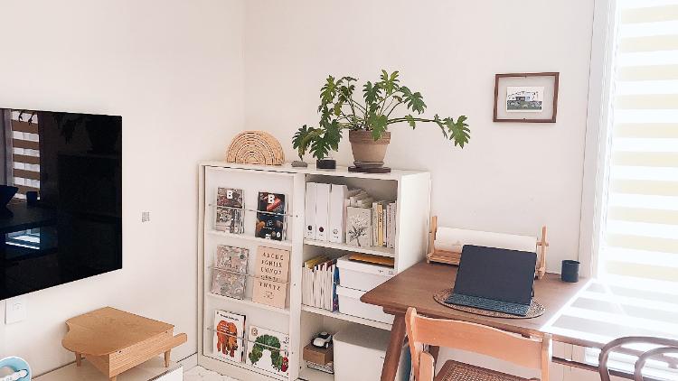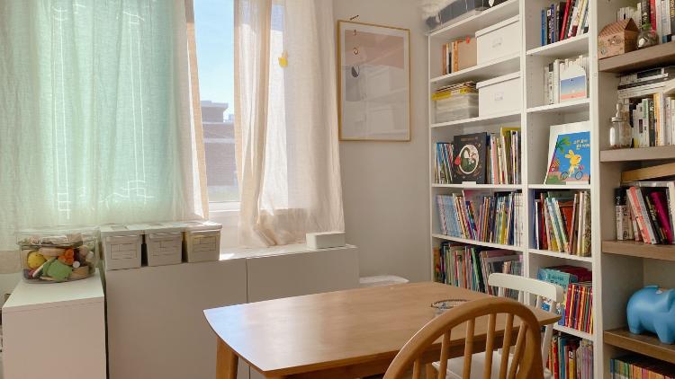 아이의 책이 많아지면서 전면 슬라이드 책장을 거실로 빼고, 높은 책장을 추가하여 아이의 책과 저희의 책을 정리했어요. 이곳도 마찬가지로 낮은 곳과 높은 곳을 나누어 정리하여 함께 사용하는 공간이 되었습니다. 그리고 테이블은 예전에 사용하던 2인용 식탁을 아이 방으로 옮겨 사용하고 있어요. 책도 읽고, 그림도 그리는 공간이 되었습니다.