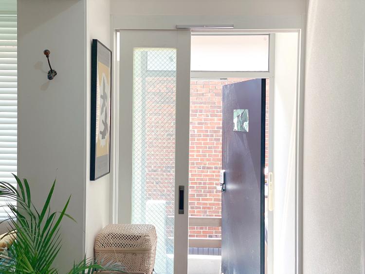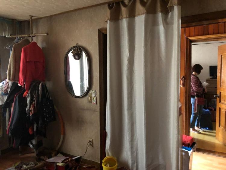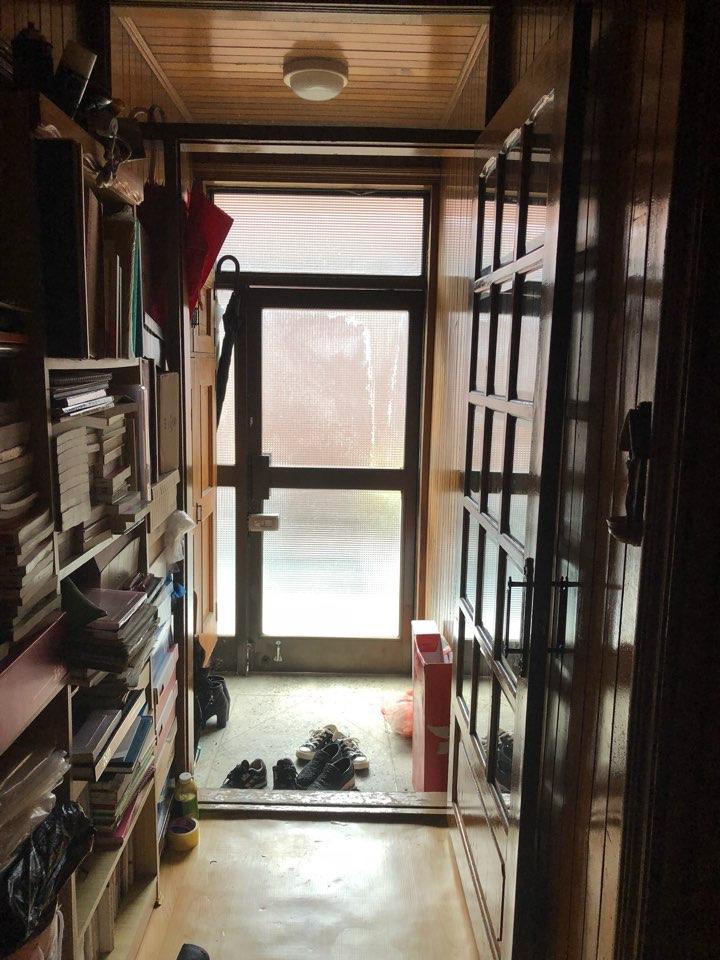 공사 전에는 책을 현관 옆에 쌓아두니 좁은 느낌이 있었어요. 그런데 지금 보니 빈티지한 느낌이 들기도 하네요. 하하 어두운 현관을 화이트로 바꾸고 슬라이드 중문으로 교체했어요.