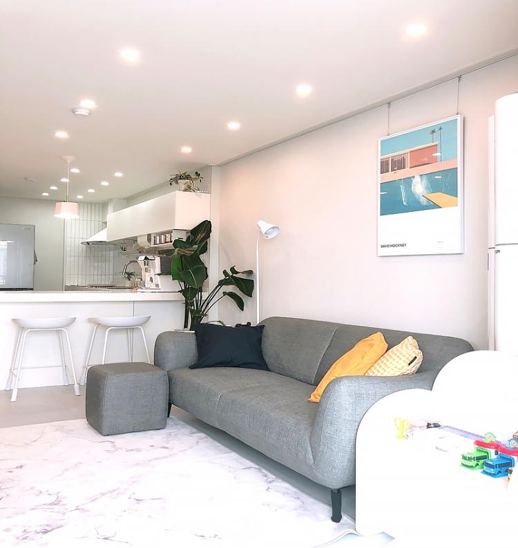 거실은 가족들이 가장 오래 머무는 공간이기 때문에 홈스타일링에 가장 신경을 쓰는 곳이에요. 여름에는 시원한 색감의 데이비드 호크니 그림을 걸었더니 확실히 집이 더욱 시원하고 깨끗해 보이는 효과가 있더라고요. 개인적으로 액자는 참 중요한 요소인 거 같아요.