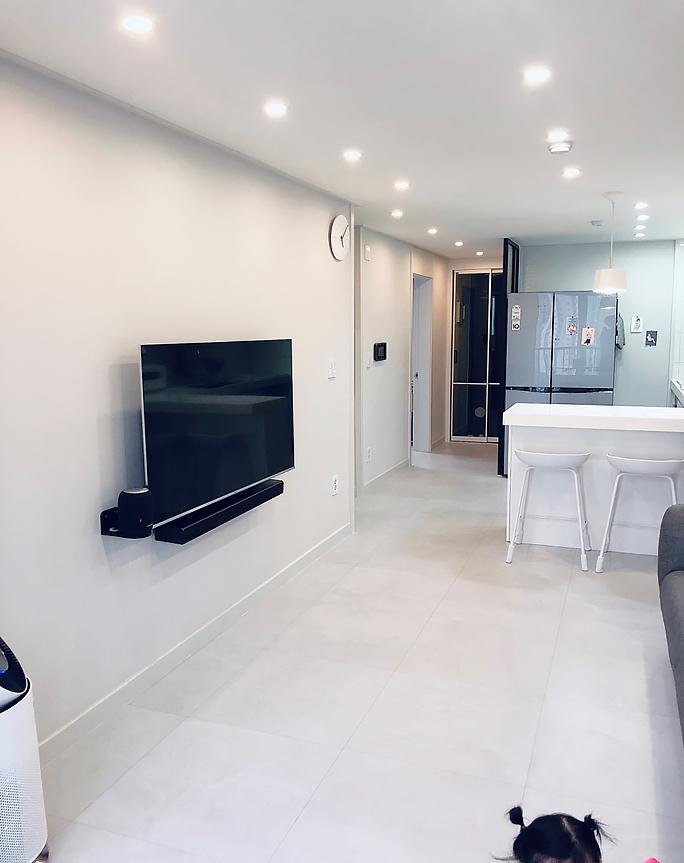 거실 반대편 벽면에는 따로 거실장을 두지 않고 심플하게 티비만 벽걸이로 설치했어요. 그리 크지 않은 집이라 한쪽 벽만큼은 비워서 여백을 살리려고 노력했답니다.