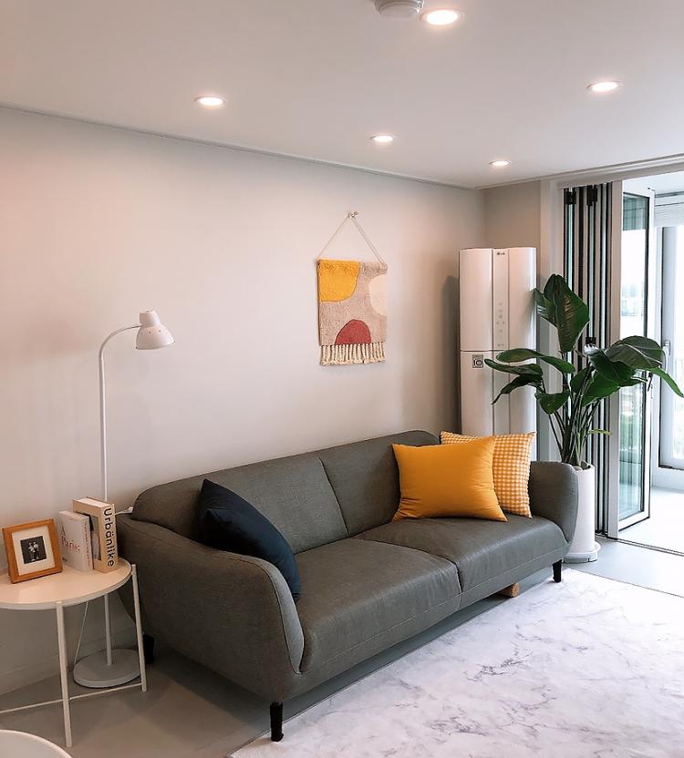 벌써 가을이네요. 저희 집도 지금은 거실 벽에 월행잉을 달아서 조금 더 따뜻한 느낌을 주었어요. 월행잉의 머스타드 색이 소파의 쿠션 색들과 잘 어울리는 듯하네요^^