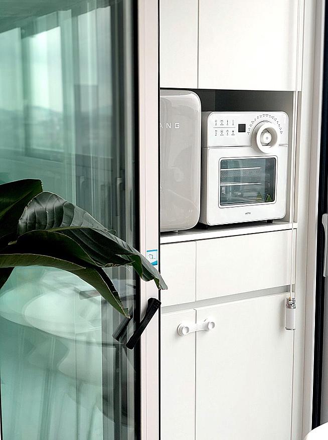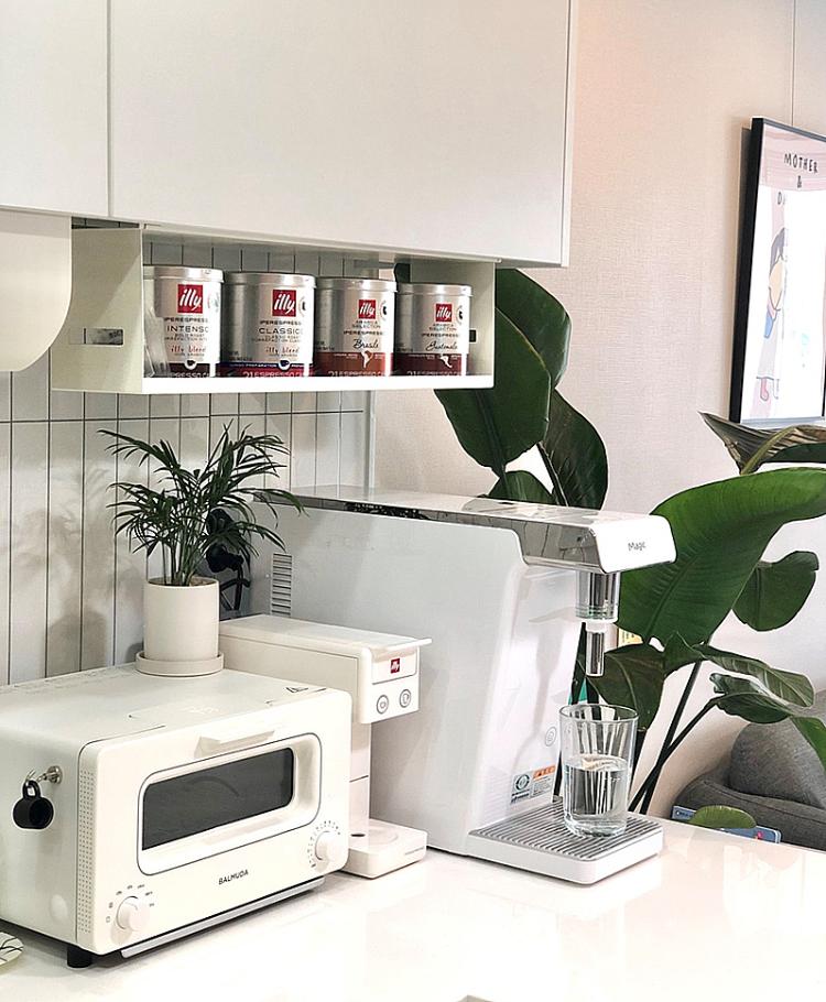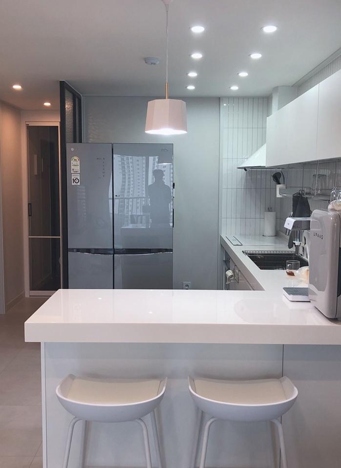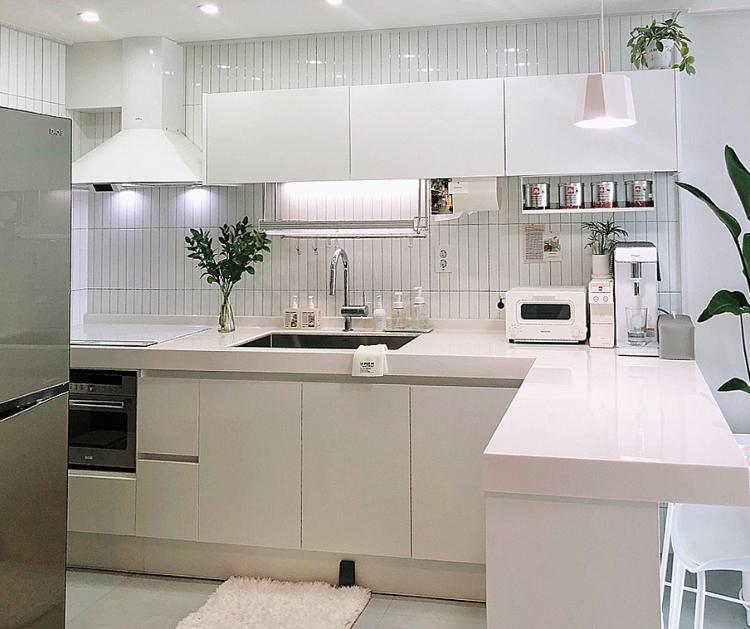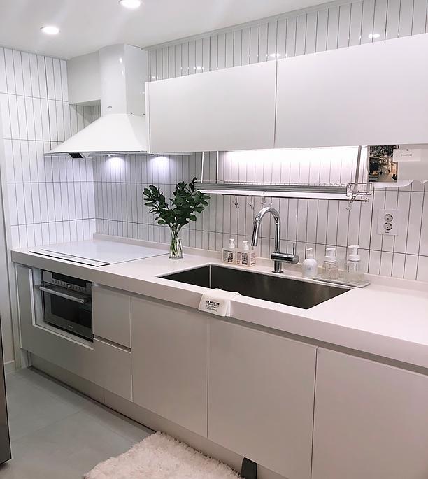 전체적으로 화이트 주방이구요. 제 키가 172cm로 꽤 큰 편이라 하부장 높이를 최대한으로 높였어요. 90cm이상으로 높였는데 키가 큰 남편도 허리를 굽힐 필요가 없어서 오히려 남편이 저보다 주방에 있는 시간이 많은거 같아 저로서는 너무너무 좋아요.