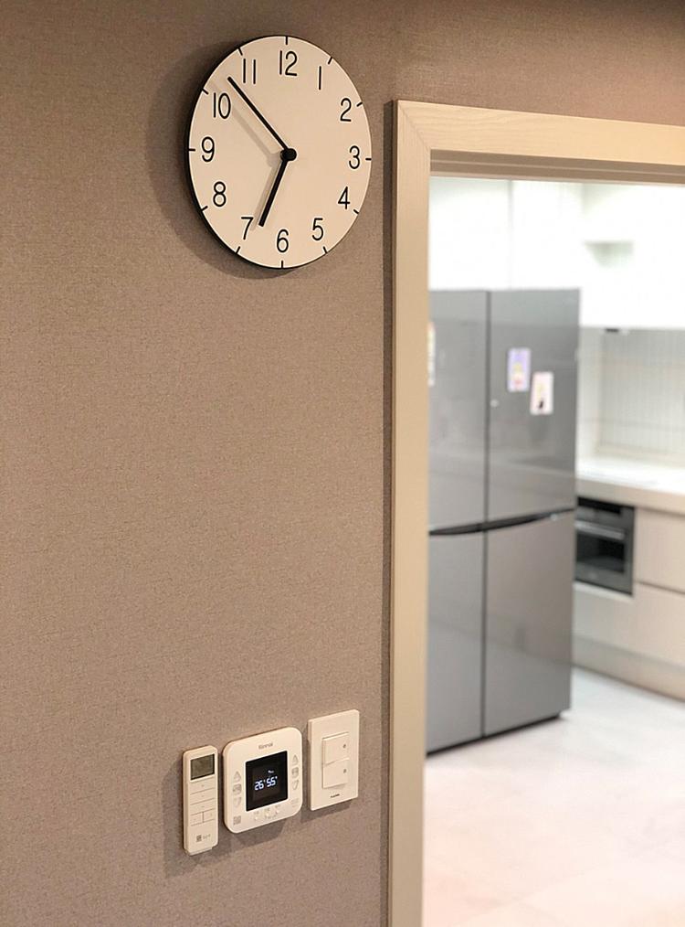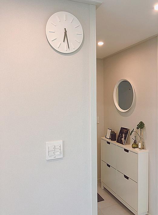 침실 벽면에는 시계 하나와 전동 블라인드 리모컨을 두었답니다. 전동 블라인드는 아이를 재울 때 터치 한 번으로 블라인드를 내리고 올릴 수 있어서 아이 있는 집에 정말 강추하는 제품 중 하나에요.