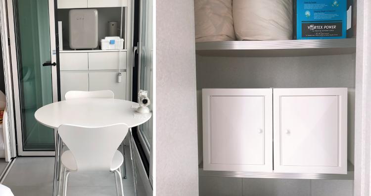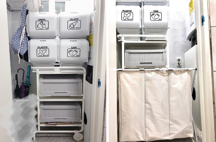 그리고 안쪽에 문이 하나 더 있는데 이곳에 분리수거함을 두었어요. 깔끔하게 정리할 수 있어서 너무 편하고 분리수거를 해야 할 지저분한 박스들이 많을 때는 이곳에 넣어두고 문을 닫으면 보이지 않아서 깔끔하답니다.