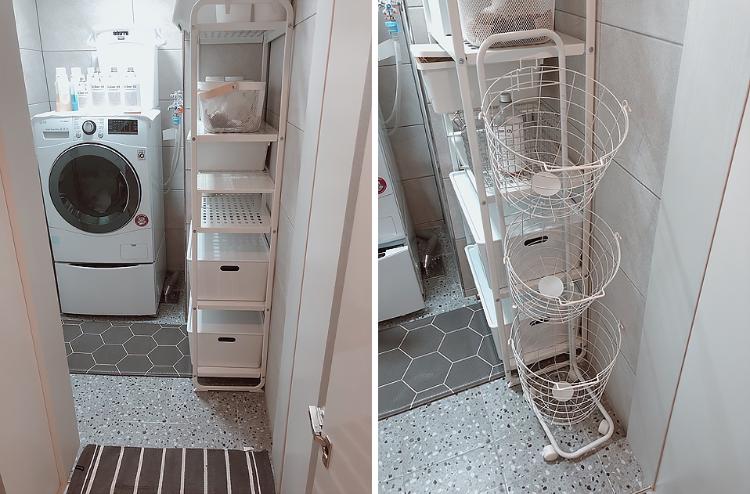 욕실 앞 수납장이에요. 이곳에 욕실 수납장에 다 수납하지 못한 기타 욕실용품들을 수납하고 있어요.
