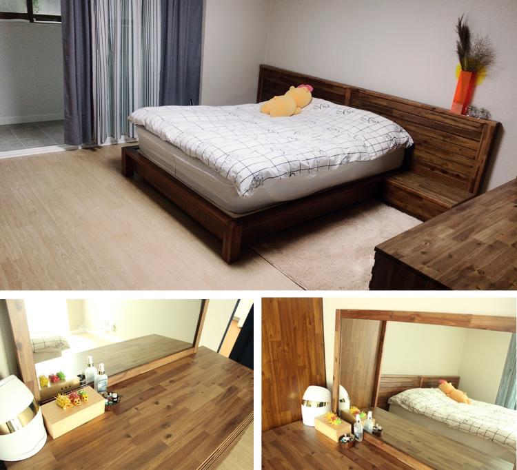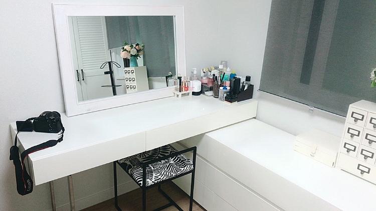 깔끔한 것을 좋아하는 저는 옷이 밖으로 나와있는 것을 선호하지 않습니다. 그래서 드레스룸은 행거 대신 옷장을 사용하고, 화장대도 최대한 수납공간이 많은 스타일로 구매했답니다..