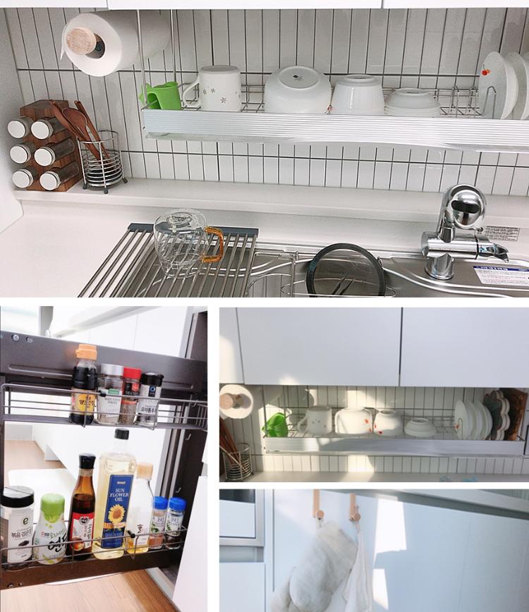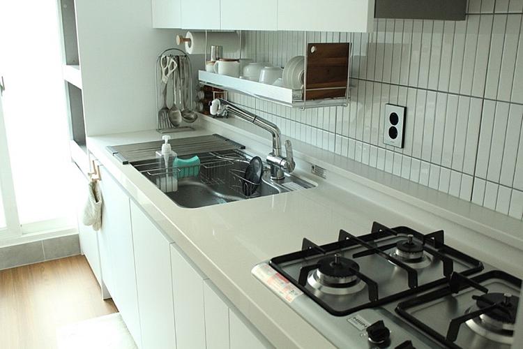 좁은 주방을 시원하게 보이게 하기 위해 온통 화이트로 구성하였고, 최대한 수납공간을 많이 구성해 정리 정돈에 용이하게 설계했답니다. 레트로 감성의 타일과 화이트 싱크대에 원목 주방용품들로 포인트를 주어 변화를 주었답니다.