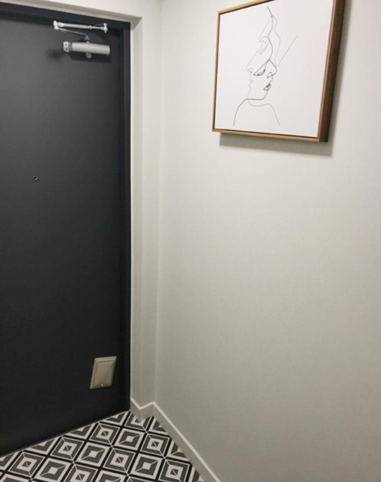 현관입구는 모던한 느낌을 주기위해 뉴트럴계열의 칼라를 사용했습니다. 바닥엔 장식 데코타일을 깔아 포인트를 주었습니다.