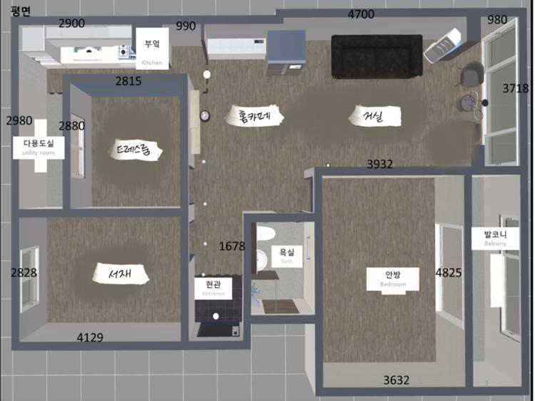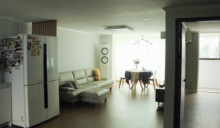 이번에 소개하게 된 우리집은 32평 일반적인 아파트를 부부의 취향과 라이프스타일을 고려해 리모델링 했습니다. 우리 부부는 주로 거실에서 생활하기때문에 거실을 넓게 사용하고 싶었고, 아이가 없고 요리를 아주 간단하게 하는 스타일이며 환기를 중시하기때문에 부엌을 다용도실 창문쪽으로 이동하고 부엌이 있던 자리를 홈카페로 변경하였습니다. 거실쪽 발코니는 확장공사를 하고 안방쪽은 그냥 두었습니다. 전체 인테리어 컨셉은 화이트와 월넛 우드칼라에 블루로 포인트를 준 심플 모던함입니다. ^^
