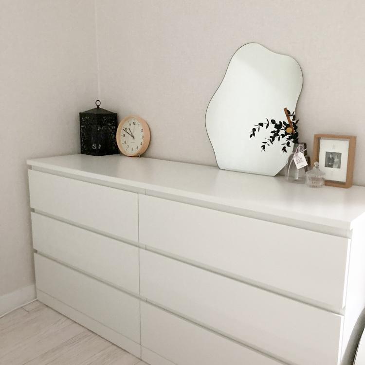 집이 크지 않다 보니 화장대와 옷 수납장을 둘 다 놓을 수 없어 이렇게 사용하게 되었는데 오히려 깔끔하고 좋은 것 같아요.