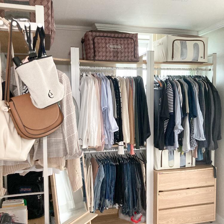 여기는 이 집에서 제일 짐이 많은 옷방입니다. 옷장을 새로 구입하여 깔끔하게 수납하고 싶기도 했는데 욕심을 버리고, 제가 사용하던 시스템 행거를 가져와 같은 제품으로 추가 구매하여 드레스룸을 완성시켰어요.
